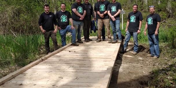 Our Delaware Chapter partnered with IGS Energy employees for their annual volunteer day. Nine IGS employees chose our Alum Creek bridle trail project. The first phase involved the complete tear down and removal of the old platform, moving the waste lumber to the road where it was then loaded into an Alum Creek Park service dump truck. The IGS volunteers carried 9-4 x 6 x 16′ support beams, 65-2 x 6 x 6′ top boards and 6-2 x 4 x 12′ side boards to the work site plus all the tools and 25-80 pound bags of concrete mix. Due to the propensity for flooding in the this area, 12 concrete slabs were created for the support beams to rest upon and secured with rebar. Our chapter is grateful and most appreciative for the help from this awesome team of volunteers from IGS Energy. We look forward to a continued partnership on a project next year!